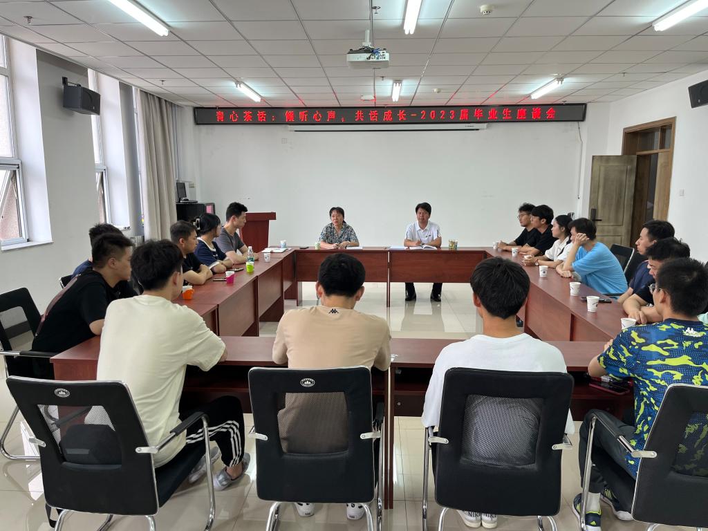 在院楼715会议室召开2023届毕业生座谈会,院党委书记曹凤才出席。就业辅导员孟伟、毕业生代表参加座谈会,院党委副书记(副院长)魏媛媛主持座谈会。