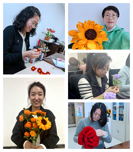 在工作人员的讲解和指导下,老师们制作了向日葵、玫瑰、柿子、郁金香等等。老师们很享受自己动手制作的过程,将自己对美的感悟和生活的美好期许融入自己的作品创作中去,也在互相欣赏和点评中不断完善作品。
