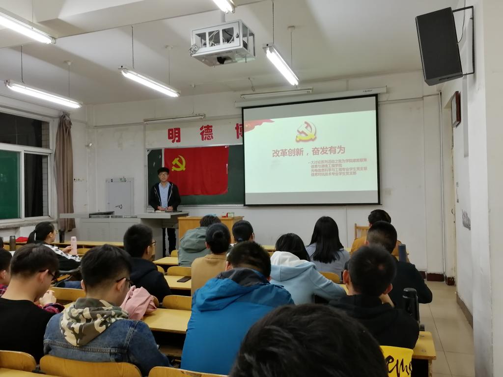 学生党支部在10206Z教室举办了“我为改革创新做什么”主题党日活动,会议由光电信息科学与工程专业学生党支部副书记余成臻同志主持。