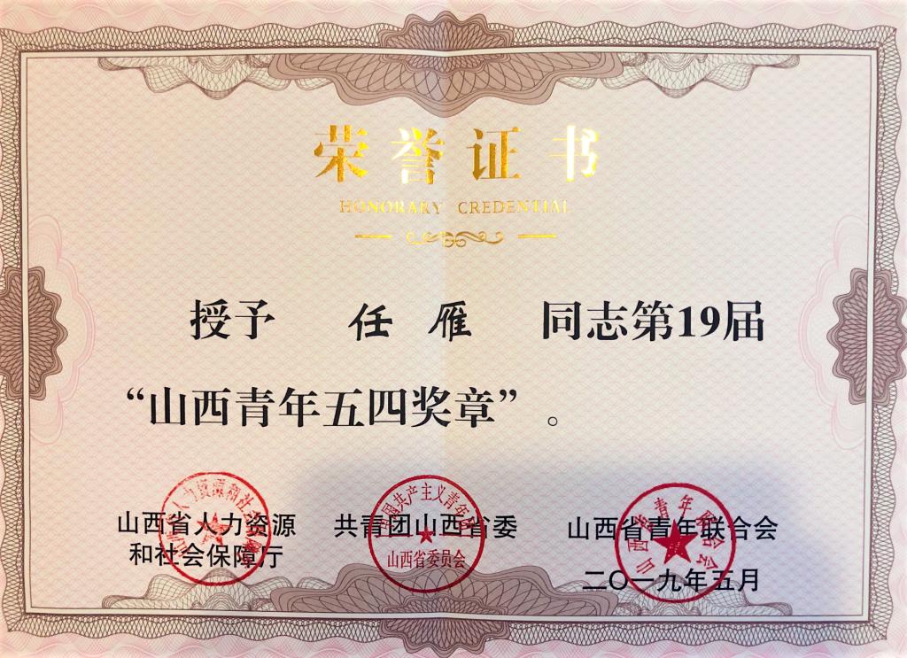辅导员任雁喜获第十九届“山西青年五四奖章”。