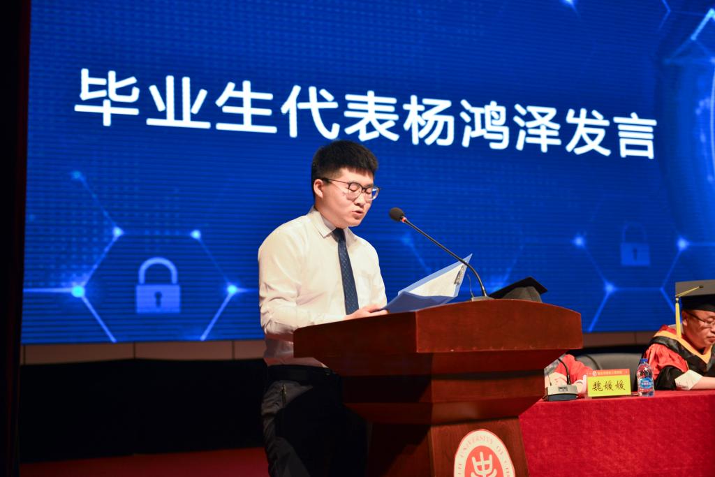领导、老师的感激之情和对同学、朋友的不舍之情,一句“再见,同学;你好,校友”,让无数同学潸然泪下。在校生代表王艺璇同学表示将继承学长、学姐们的精神,报效祖国,回报社会,同时也祝愿学长、学姐们在日后事业中鹏程万里,前程似锦。
