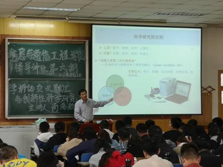 首先,尚禹教授向同学们介绍了几位著名的近代科学家,展示了这些科学家研究涉及领域的广泛性,指出了学科之间的关联性,用事实证明了科学研究需要开阔的眼界以及各个学科的交叉融汇。