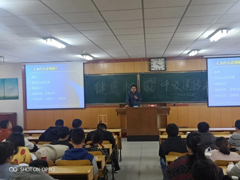 与校医院公共卫生科联系,于11月20日下午4:00在06502H进行“健康校园—呼吸道传染病预防保健”知识讲座,学院近150名学生参加。