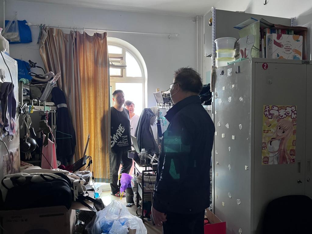 党委书记曹凤才、党委副书记魏媛媛带队,全体辅导员、班主任共同深入学生宿舍,对于宿舍卫生、易燃物、违规电器和管制刀具等情况进行全面的检查。