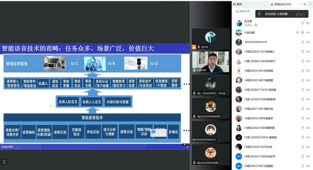 孙成立教授以近期语音增强深度学习方法发展为主线,结合国际各类语音竞赛获奖团队采用的系统方案,论述了语音增强深度模型的技术演进,并充分展望了未来声学前端技术的发展趋势。讲座过程中,孙教授与广大师生还就深度学习目前网络模型的设计及应用进行了讨论,孙教授对提出的问题给予了认真耐心的解答,令大家受益匪浅。