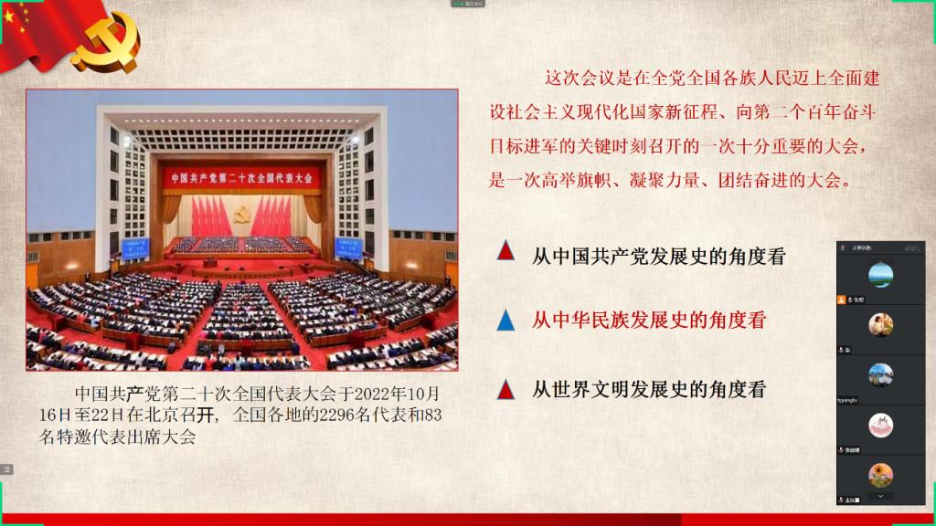 首先,张权老师从党的二十大主题和丰硕成果、过去5年的重大成就和新时代10年的伟大变革、全面建设社会主义现代化国家的目标任务、坚持党的全面领导和全面从严治党等多方面解读党的二十大精神。同时,张权老师结合自身工作经历和阅历,从喜庆党的二十大胜利召开,踔厉奋发谱新篇、奋力推进“两个先行”,擘画未来五年宏伟蓝图、为“两个先行”贡献力量等方面,为支部全体党员上了一堂生动的党课。他强调支部全体党员要深入学习、深刻领会,真正做到“学思践悟”,要以学习贯彻党的二十大精神为动力,奋力把“两个先行”在本专业的实践推向前进。