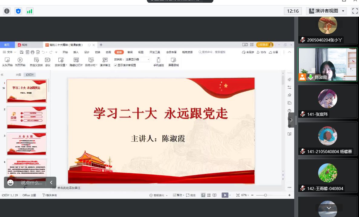 为深入学习宣传贯彻党的二十大精神,2022年12月10日晚19:00,电子信息工程学生党支部利用腾讯会议平台开展学习,党支部书记陈淑霞老师主讲了“学习二十大 永远跟党走”主题党课。