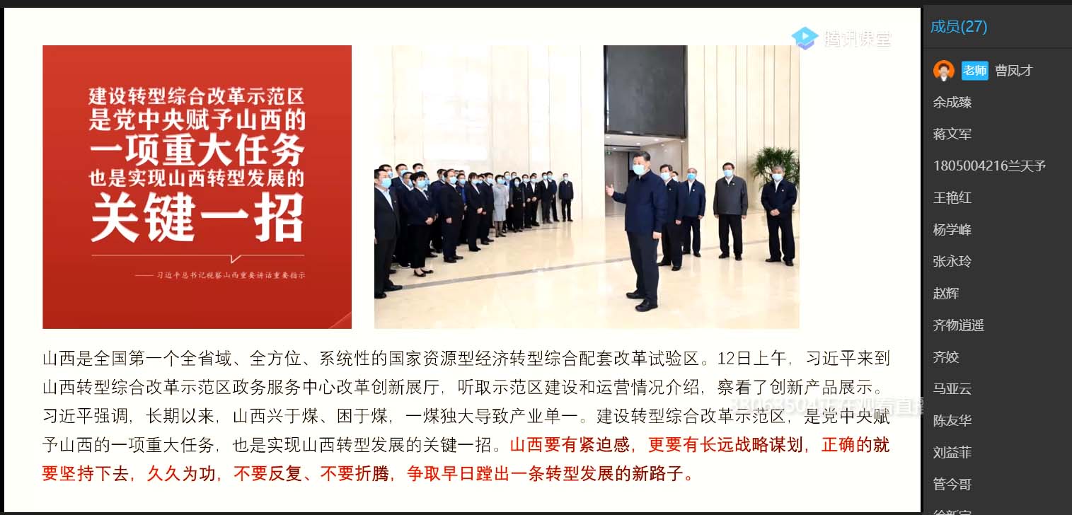 党委书记曹凤才为光电信息科学与工程专业党支部全体师生党员上微党课,通过腾讯课堂平台共同学习了习近平总书记视察山西重要讲话及重要指示精神。