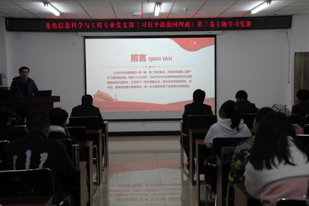 2020年11月17日下午4点,光电信息科学与工程专业教工党支部副书记刘吉带领光电专业全体师生党员在科学楼B座715会议室开展《习近平谈治国理政》第三卷主题学习党课。