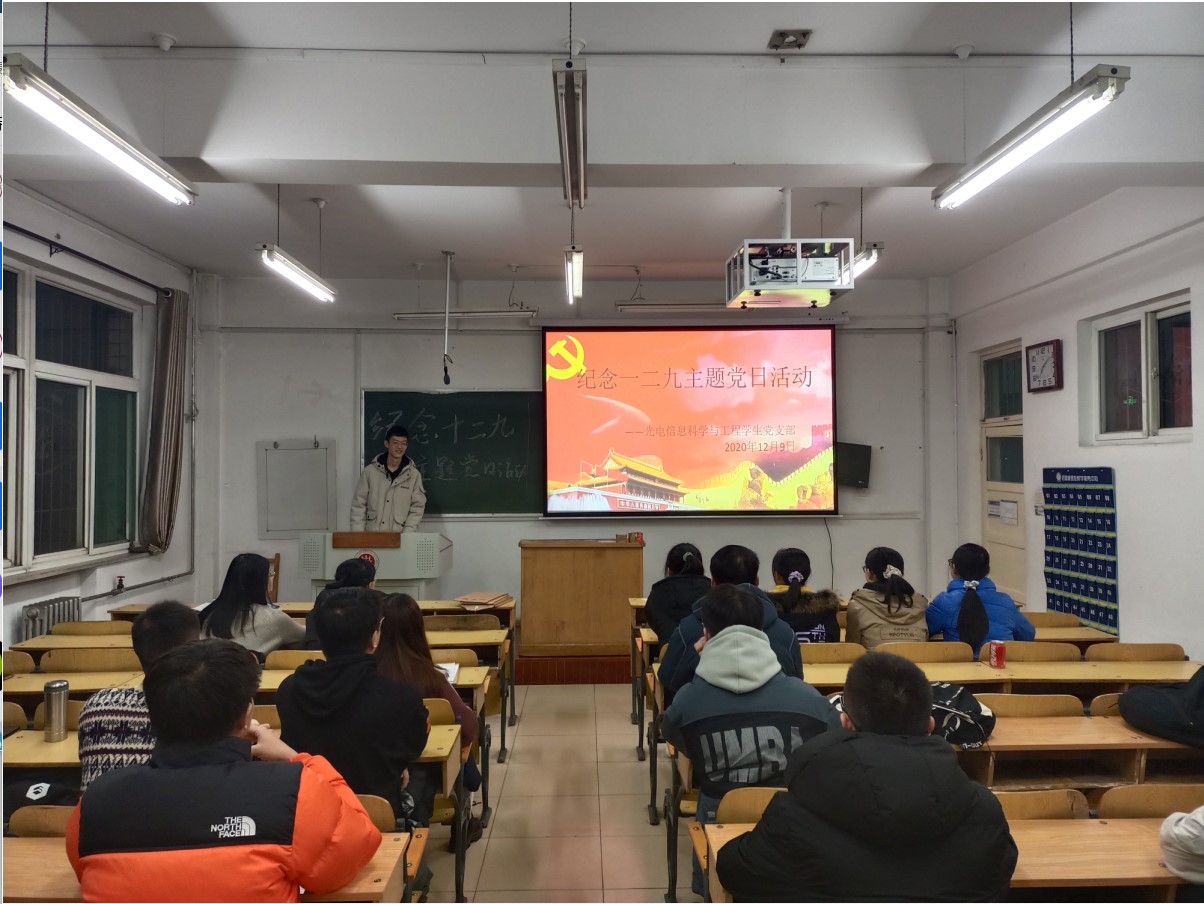 为弘扬一二•九运动中青年同志所展现出来的国家责任感,继承和发扬一二•九运动的爱国主义精神,光电信息科学与工程专业学生党支部于2020年12月9日晚七点在10303Z开展了纪念一二•九运动主题党日活动,支部副书记兰天予主持,全体党员参加。