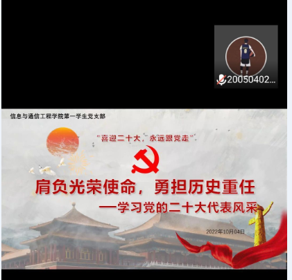 如果信仰有红色,那一定是中国红。中国共产党第二十次全国代表大会将于10月16日在北京召开。为迎接即将召开的党的二十大,2022年10月5日晚7点电子信息工程专业学生党支部组织党员、发展对象、积极分子集中观看了“二十大代表”风采视频,学习榜样精神。